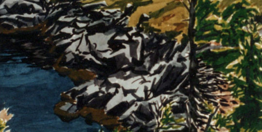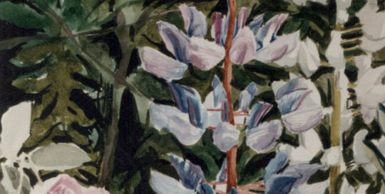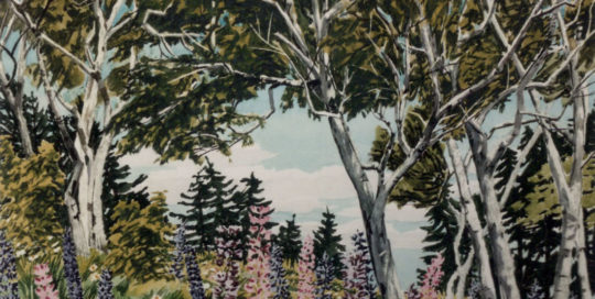 admin2018-09-25T21:59:29-04:00Lupins and Birches 15 x 22 inches The contrast of the colourful uniformed lupins against the less colourful erratic branches of the birch tress creates a tension within the composition. Lupins are found everywhere in New Brunswick. Chin, our instructor, suggested we should take some lupin seeds back to Ontario and spread them around. He thought it would add more